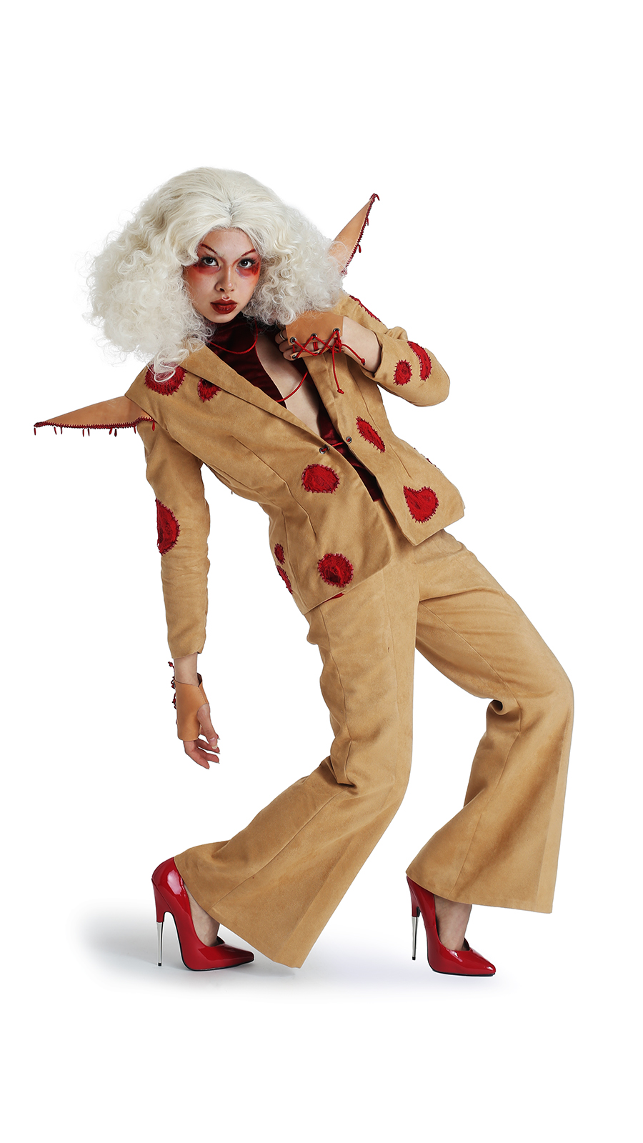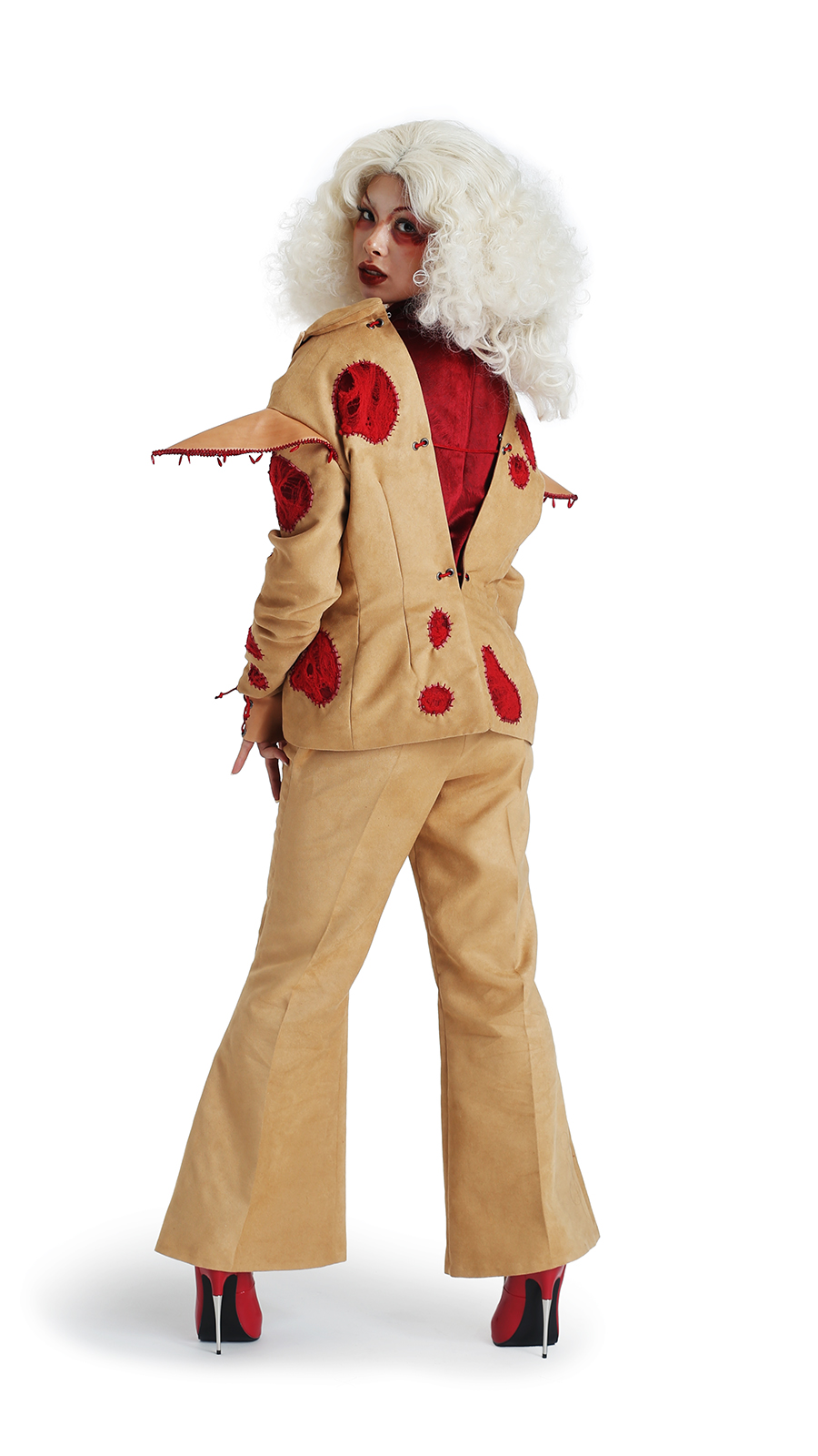 Basar (בשר) was initially inspired by kriah, a Jewish mourning ritual surrounding the tearing and mending of clothes. It tells the story of grief as it impacts the body, from when a wound is first torn open to when it scars over. Featuring nude base fabrics, bold crimson accents, leather accessories, and hand embroidery, Basar is filled with visceral imagery of flesh and skin as it celebrates the human body’s capacity to break apart and to heal. Because the line depicts a change, each individual look transforms on the runway, from a skirt ripped in half down the center to a patchwork robe that becomes a cape. Basar takes inspiration from drag, burlesque, and other forms of queer theater in order to make each look a dynamic piece of performance art, meant to be watched, touched, and even heard.