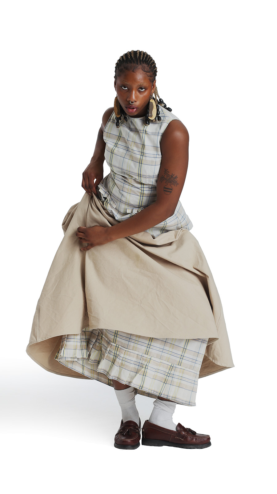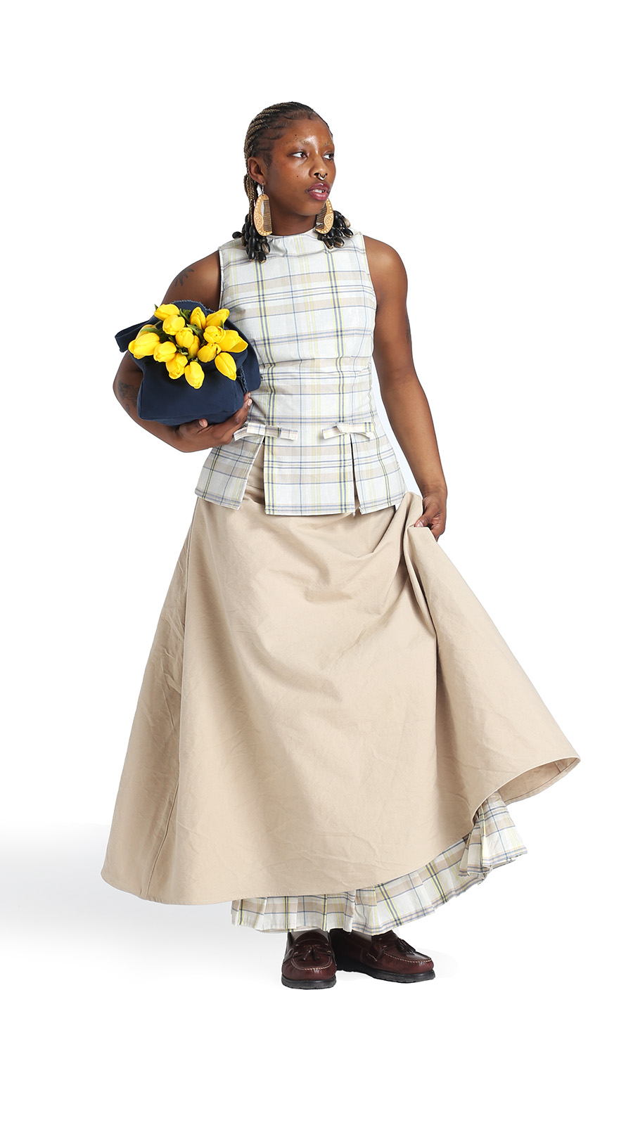 Much of the designer’s inspiration is rooted in childhood memories spent at a grandparent’s apple orchard. Among the many apple varieties, the Cortland held a special place, not for its taste, but for its striking appearance. After being picked, the apples would be coated in a dull film, a natural shield against the sun’s harsh rays. But once polished, they revealed brilliant red skin and crisp, bright white flesh beneath. That quiet transformation, from something ordinary into something eye catching, echoes the designer’s creative philosophy. Just like those apples, the garments in this collection began as overlooked scraps. But with care, imagination, and intention, they have been polished into something beautiful.